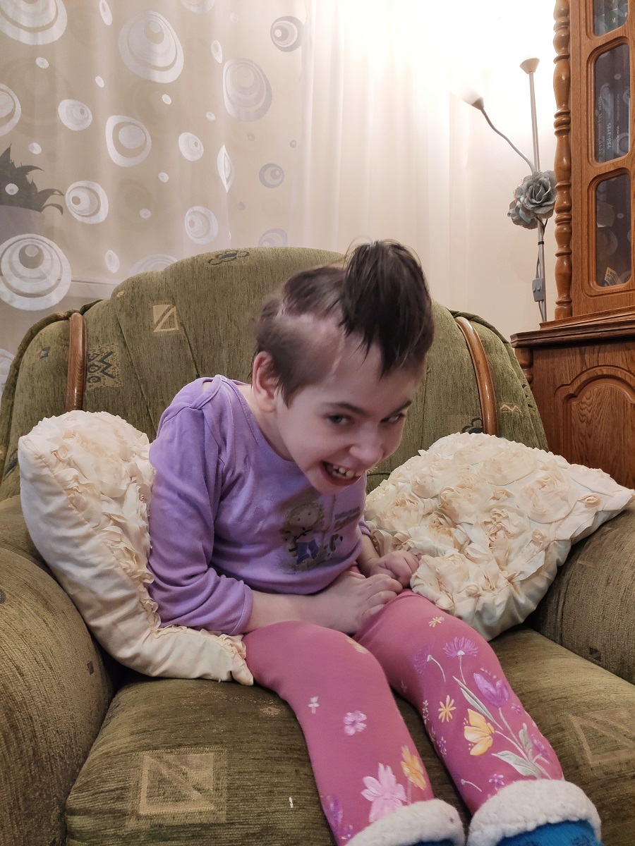 Nasza Bohaterka urodziła się z przepukliną oponowo-rdzeniową – do tego dochodzą: wodogłowie wielokomorowe, pęcherz neurogenny, zespół Chiari II, padaczka lekooporna… Przeszła też wylew i to on wyrządził najwięcej szkód – zmian w mózgu nie dało się już cofnąć, a to z kolei odebrało największą nadzieję… że Mila będzie rozwijała się podobnie, jak jej rówieśnicy. Dziś, choć ciało rośnie… to umysł pozostał na poziomie dwuletniego dziecka – typowe dla takich maluchów są właśnie takie zachowania, związane z otwieraniem szafek i wyrzucaniem z nich zawartości. Charakterystyczna jest także przekora… bo Milenka, według domowników ma bardzo dobry kontakt z otoczeniem – co zresztą sama potwierdza, gdy pada pytanie: „Rozumiesz, co do Ciebie mówię?” – wówczas kiwa głową… jednak i tak robi to, na co ma ochotę – czyli zwykle na odwrót. Kolejna kwestia, to bardzo ubogie słownictwo… Milenka porozumiewa się tak, jak dziecko które dopiero zaczyna mówić: „Słyszę: „tam” i widzę, że córka pokazuje pokój brata albo siostry… wtedy wiem, że chce spędzić czas z rodzeństwem. Bardzo lubi u nich przebywać… podgląda ich zachowania i naśladuje. Z zainteresowaniem patrzy na przykład, jak Mateusz (brat Milenki) gra na komputerze.” Dziewczynka posługuje się takim trochę kodem, zrozumiałym tylko dla bliskich: „yyy” – to brat, „Karolina” i „Milena” – to „na”, bo tak kończą się imiona dziewczyn: naszej podopiecznej i jej siostry. Pojawiają się jednak także odpowiedzi, które nie budzą żadnych wątpliwości: „Pytam: „Kto kocha Cię najbardziej na świecie?” – pada: „Mama”. A gdy dopytuję, jak bardzo ją kocham, to wzdycha: ‘Ach!’” – opowiada wzruszona pani Anna.