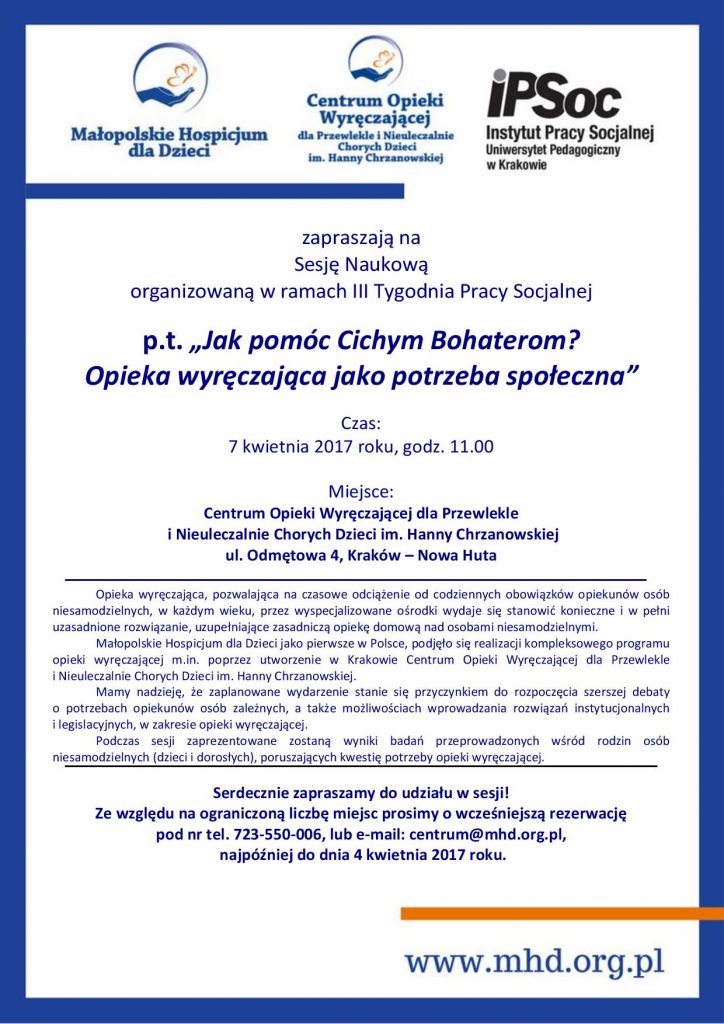 Zarząd Małopolskiego Hospicjum dla Dzieci i nasza Rada Naukowa zapraszają do udziału w Sesji Naukowej n.t. „Jak pomóc Cichym Bohaterom? Opieka wyręczająca, jako potrzeba społeczna.”,